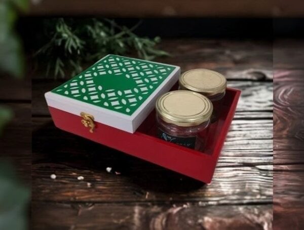 This simple yet stunning Make festive gifting extra special with a festival gift box with jar compartments! Thoughtfully designed to hold sweets, dry fruits, and treats in stylish jars, it’s a perfect gift for any celebration